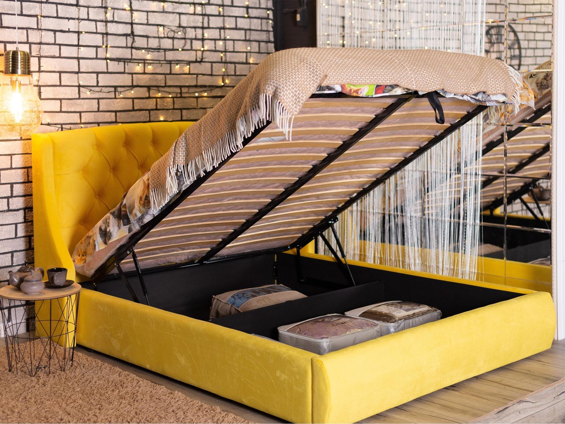 Ценители прекрасного поистине оценят мягкую интерьерную кровать Stefani из ткани с подъемным механизмом и высоким изголовьем.